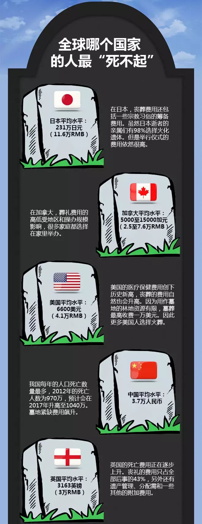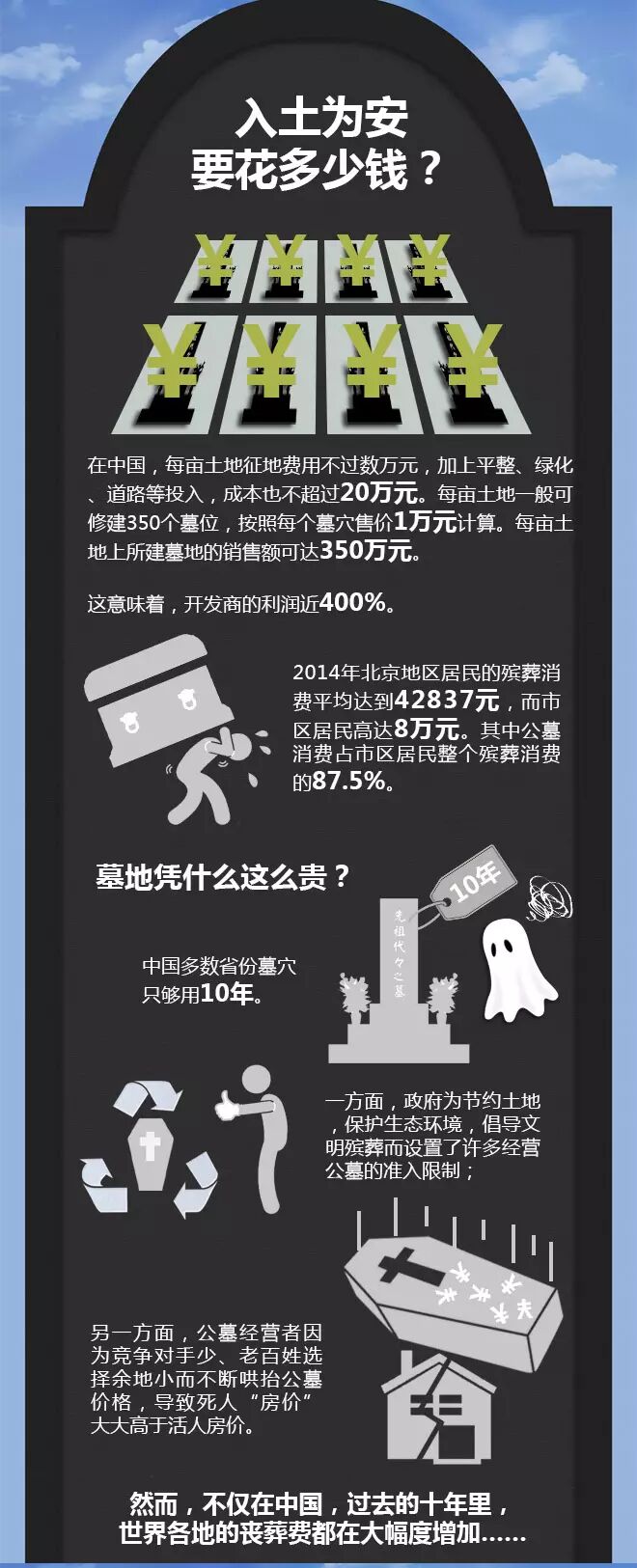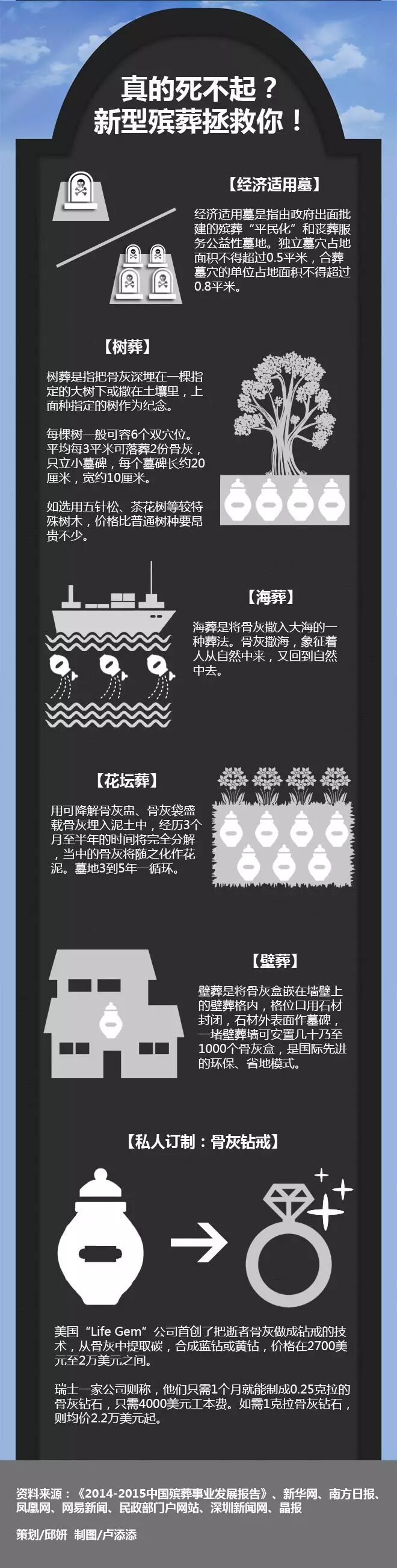 比想生但生不起更无奈的是什么?或许也只有想死也死不起了吧。在过去的十年中,中国物价涨个不停,连丧葬费也连带着一起飙升。且不说丧仪开销,单是墓地一项就让人操碎了心。 “入土为安”一直是中国人传统的丧葬观念,但如今有报道称,由于土地资源短缺,北京、上海、广州等大型城市很多公墓都出现墓地紧缺情况,开始限售墓位。渐成为稀缺性资源的墓地价格飙升,直逼豪宅。在这种情况下,人生最心塞的事,莫过于“人没死,墓地又涨价了”! 人固有一死,但如今高昂的安葬费用却让许多家庭难以消受,造成“穷人死不起”的结果。事实究竟是不是这样呢?除了传统的“入土为安”还有没有其它选择呢?用大数据告诉你吧!