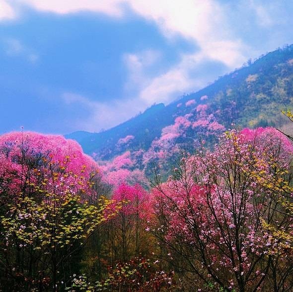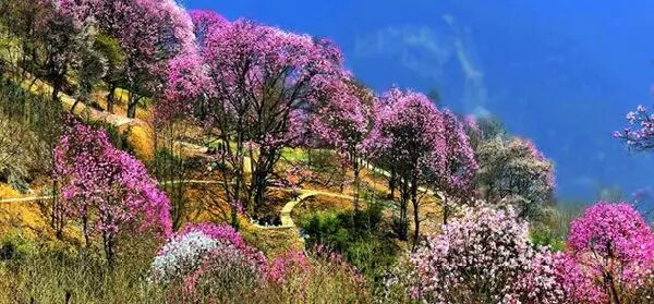 辛夷花是药王谷最著名的药花,也是世界上最壮观的花。每年四月成片的辛夷花和依山成势的野花次第开放,缤纷灿烂、如烟似霞,粉红色的梦中,时而下起辛夷花雨,漫步其中,似误入了瑶池仙境。