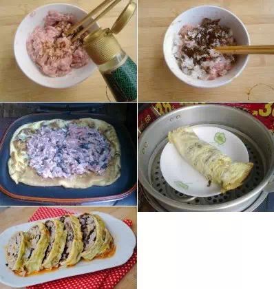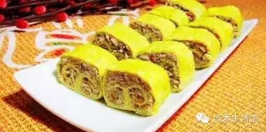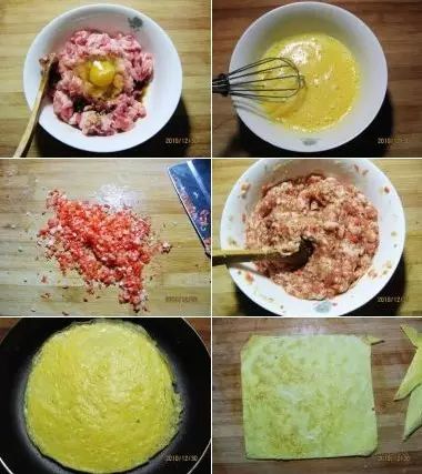7.蛋皮煎面朝上,抹肉馅。 8.将蛋皮从一端卷,卷到中间停止。