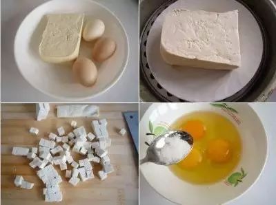 1.主要原料豆腐大约200克,鸡蛋3枚。 2.豆腐放入蒸锅大火蒸透。(大约十分钟)