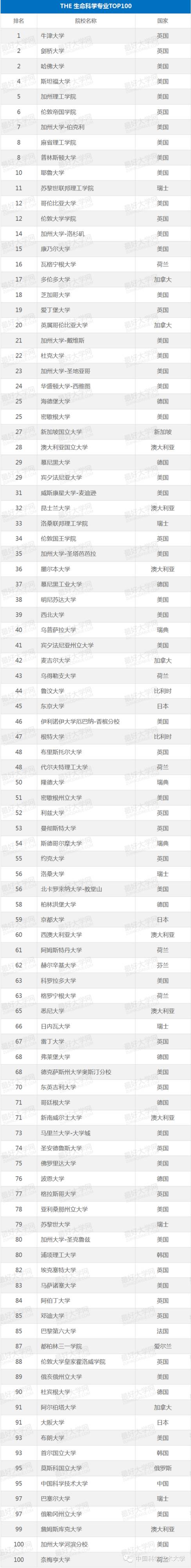 THE发布“2016生命科学专业百强大学” 中国科大成为唯一进榜的中国高校 在泰晤士高等教育报今日公布的“生命科学专业世界百强大学”排名中,英国高校首次登顶,美国高校在此领域地位日益衰落,亚洲高校名次良莠不齐,而 中国高校则首次进入榜单,中国科学技术大学作为入选榜单的唯一的中国高校,与莫斯科国立大学并列第95名。 牛津大学、剑桥大学、哈佛大学、斯坦佛大学、加州理工学院排名前五名。 美国高校逐渐没落 虽然美国有36所高校进入百强名单,上榜数量是英国高校的两倍,但同比去年,有三所高校排名跌出百名以外。这些学校名次退步亦影响到了美国顶级高校的排名,这是有史以来非美国高校在该学科领域排名登顶。美国进入20强的高校数量也从13所跌至11所。 剑桥大学再创佳绩 剑桥大学生物科学院的院长阿比盖尔?佛登(Abigail Fowden)认为,鼓励研究员跨学科合作,跳脱出学校的桎梏进行思考,是剑桥大学排名创造佳绩的主因。她说:“剑桥和周边区域有条件很好的研究所和生物科技公司,还有其他一些配套产业,这些都可以给我们带来富有成效的合作。” 瑞士高校表现不俗 瑞士在此次排名中大展手脚,共有6所高校上榜。瑞士排名最高的学校是位于苏黎世的瑞士联邦理工学院,仅次10强,位居第11名。该校每年排名都在不断地向10强靠拢,从2011年的第23名到如今的第11名,在生命科学领域的研究发展蒸蒸日上。 亚洲高校良莠不齐 亚洲高校表现各不相同。新加坡国立大学首次进入30强,位列第27名,中国高校首次进入百强榜单——中国科学技术大学和莫斯科国立大学并列第95名。日本高校不进则退,相比去年共3所高校进入榜单,今年仅有东京大学1所进入50强,位列第45名。 以下是生命科学百强高校名单